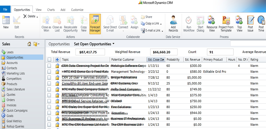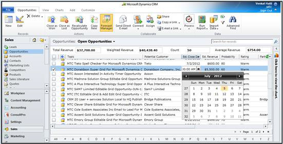 Click the Forecast Manager ribbon button for an in-place-editable Viewselectable presentation management workspace of your CRM Opportunities.