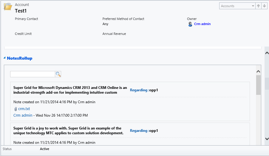 Notes Rollup for Microsoft Dynamics CRM 2011, CRM 2013 and Online is a Managed Solution add-in Upgrade to CRM. It allows Standard and Custom Entities like Account, Opportunity, Quote, Order, Invoice and other One to many relationship entities to put all Notes and attachments in parent Entity.