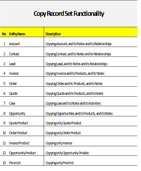 Copy a selected record in Views in Microsoft CRMs Quote, Order, Invoice, and Case entity or on form function bar to create a copy to name new and save. Copies a record in any state - open or closed. Great for template-based sales processes or repetitive orders or multiple invoice dates.
