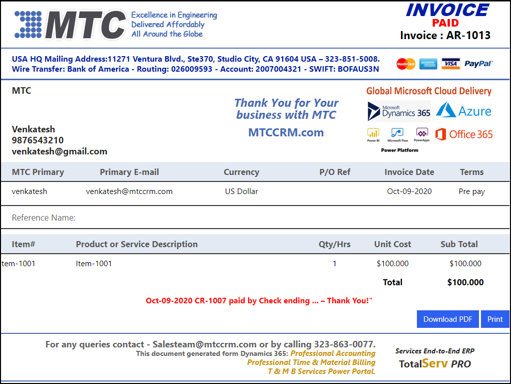 Customers can add new credit cards or edit exiting credit cards before making the final payment. They can also print the invoice received via email and download the same as PDF.